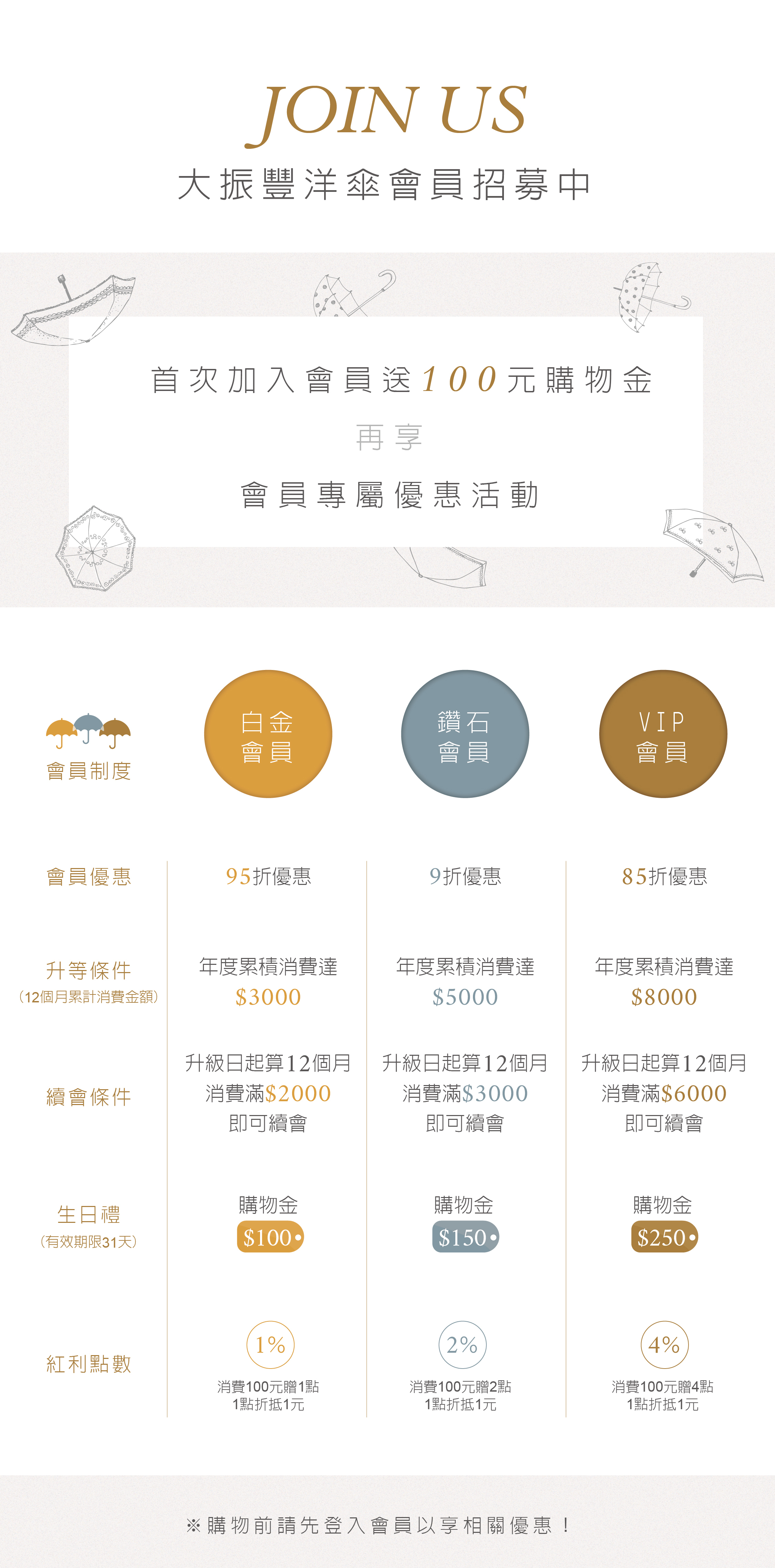 - 若無註冊、登入會員系統,將無法將消費金額累積升級。